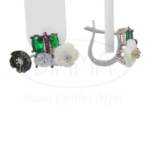 Срібні сережки з кольоровим цирконом та перламутром. Срібло 925 проби, покрите родієм. Комплект виконаний в стилі Роберто Браво, у формі квітів. Складається з каблучки та сережок.