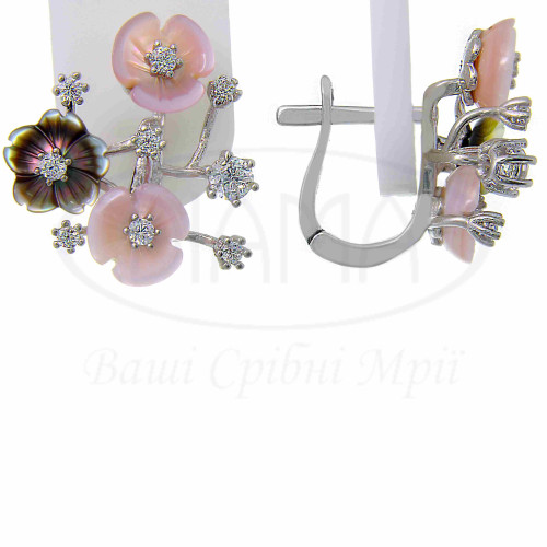 Срібні сережки з цирконом та перламутром, виконані в стилі Роберто Браво. Срібло 925 проби, покрите родієм. Складається комплект з каблучки, підвіски та сережок.