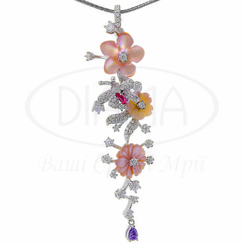 Срібна підвіска з цирконом та перламутром, виконана в стилі Роберто Браво. Срібло 925 проби, покрите родієм. Складається комплект з каблучки, підвіски та сережок.