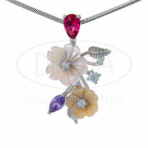 Срібна підвіска з кольоровим цирконом та перламутром. Срібло 925 проби, покрите родієм. Комплект виконаний в стилі Роберто Браво, у формі квітів. Складається з каблучки, підвіски та сережок.