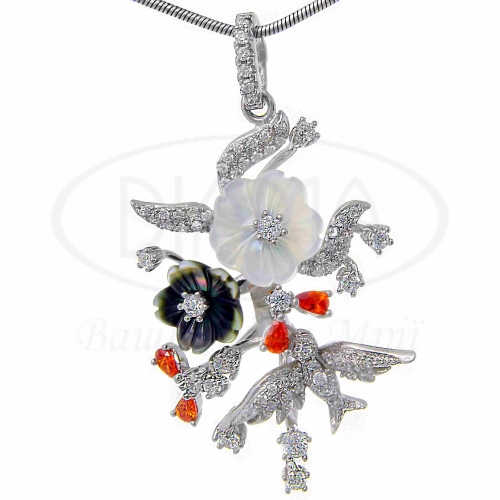 Срібна підвіска в стилі Роберто Браво з кольоровим цирконом і перламутром. Срібло 925 проби, покрите родієм. В наборі присутні каблучка, сережки та підвіска.