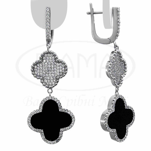 Срібні сережки з оніксом та білим цирконом. Срібло 925 проби, покрите родієм. Виготовлені в формі Конюшини. Розмір головних елементів - 14,5 + 18 мм.
