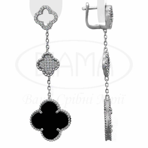 Сережки потрійні срібні з Оніксом та білим цирконом. Срібло 925 проби, покрите родієм. Сережки виготовлені в формі "Клевер". В наборі присутні сережки та підвіс.