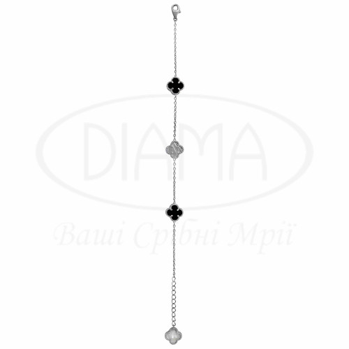 Срібний браслет 925 проби, покритий родієм. Виготовлений в формі "Клевер" з оніксом та білим перламутром. Розмір клеверу 11 мм.
