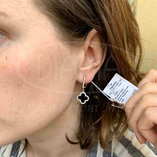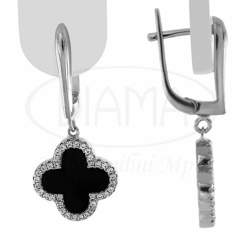 Сережки срібні з Оніксом та білим цирконом. Срібло 925 проби, покрите родієм. Сережки виготовлені в формі "Клевер". Розмір головного елементу - 14 мм. Висота сережки - 30 мм.