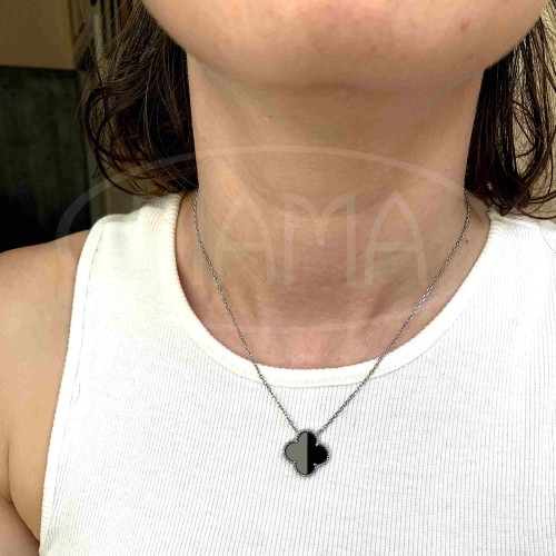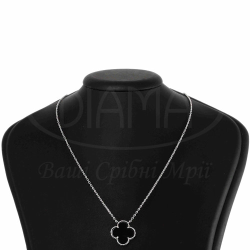 Кольє срібне з чорним Оніксом. Срібло 925 проби, покрите родієм. Підвіска виготовлена в формі "Клевер". Розмір головного елементу 18 мм. В наборі присутні каблучка, підвіска, Кольє та сережки.