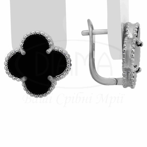 Срібні сережки з оніксом. Срібло 925 проби, покрите родієм. Сережки виготовлено в формі "Клевер". В наборі присутні каблучка, сережки, кольє та підвіс. Розмір головного елементу - 15 мм.