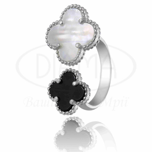 Каблучка срібна з білим перламутром та оніксом. Срібло 925 проби, покрите родієм. Каблучку виготовлено в формі "Клевер". В наборі присутні каблучка та сережки. Розмір головних елементів - 15 мм та 11 мм.