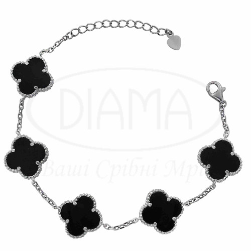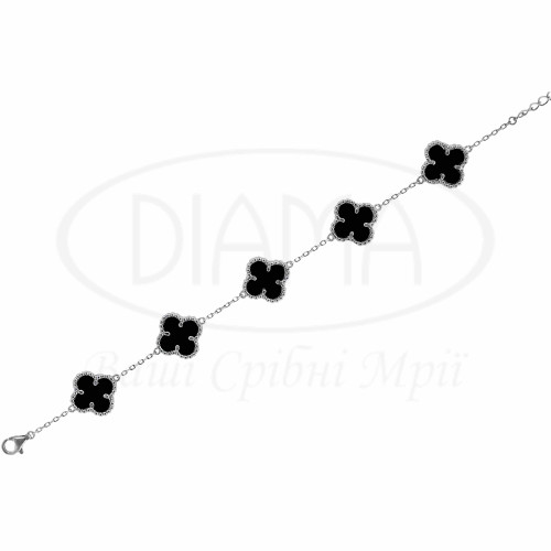 Срібний браслет з оніксом. Срібло 925 проби, покрите родієм. Браслет виготовлений в формі "Клевер". В наборі присутні кольє та браслет. Розмір головних елементів - 15 мм, відстань між ними - 1,5 см.