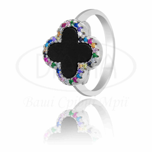 Каблучка срібна з чорним оніксом та кольоровим цирконом в формі "Клевер". Срібло 925, покрите родієм. В наборі присутні каблучка, сережки, підвіска, браслет та кольє. Розмір головного елементу 14 мм.