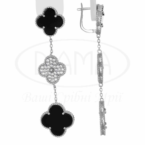 Сережки срібні з оніксом та білим цирконом. Срібло 925 проби, покрите родієм. Сережки виготовлено в формі "Клевер". В наборі присутні каблучка, кольє, сережки та браслет. Розмір головних елементів - 15 мм, 15 мм та 18 мм.