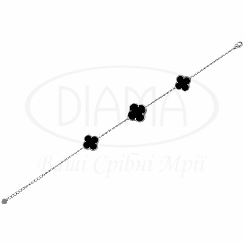 Браслет срібний з оніксом. Срібло 925 проби, покрите родієм. Браслет виготовлений в формі "Клевер". В наборі присутні кольє, сережки, підвіс та браслет. Розмір головних елементів - 15 мм, 18 мм та 15 мм. Додатковий ланцюг надає можливість змінювати розмір.