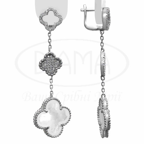 Сережки потрійні срібні з перламутром та білим цирконом. Срібло 925 проби, покрите родієм. Сережки виготовлені в формі "Клевер". В наборі присутні сережки та підвіс.