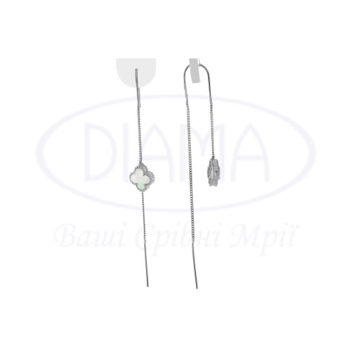 Срібна сережка з білим перламутром. Срібло 925 проби, покрите родієм. Сережки виготовлено в формі "Клевер". Розмір головного елементу - 10 мм. Сережки власного виробництва. Паличка 20 мм.
