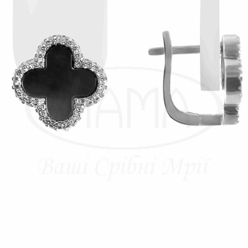 Сережки срібні з чорним перламутром та білим цирконом. Срібло 925 проби, покрите родієм. Сережки виготовлені в формі "Клевер". В наборі присутні каблучка, підвіска та сережки.