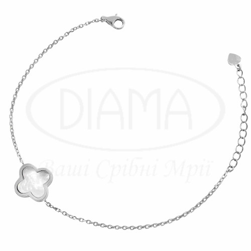Браслет срібний з білим перламутром в формі Клевера. Срібло 925 проби, покрите родієм. Розмір головного елементу 13,5 мм.