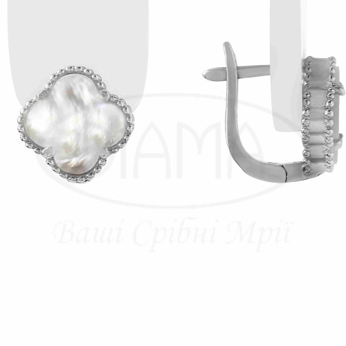 Сережки срібні з білим Перламутр. Срібло 925 проби, покрите родієм. Сережки виготовлено в формі "Клевер". Розмір головного елементу 12 мм.