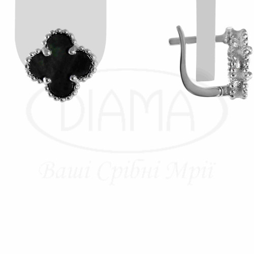Сережки срібні з чорним перламутром. Срібло 925 проби, покрите родієм. Сережки виготовлено в формі "Клевер". В наборі присутні каблучка, сережки та підвіс. Розмір головного елементу 11 мм.