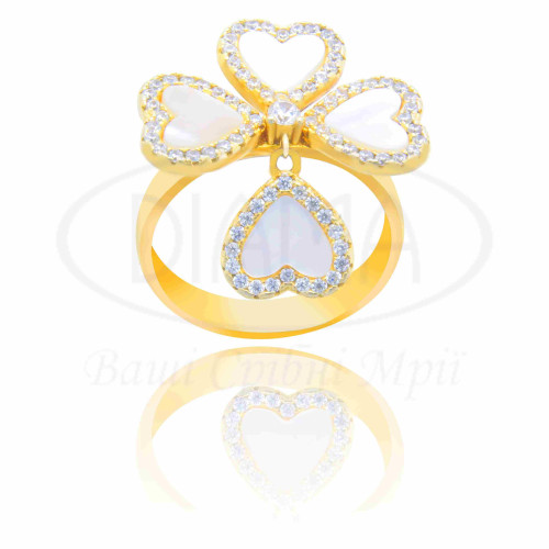 Срібна каблучка з серцями з білим перламутром та цирконом в формі "Клевера". Срібло 925 проби, покрите позолотою.