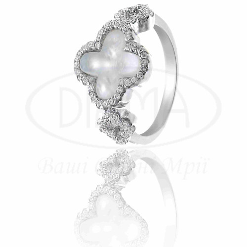 Срібна каблучка з білим Перламутром та цирконом. Срібло 925 проби, покрите родієм. Комплект виготовлений в формі Конюшини, складається з каблучки, підвіски та сережок.