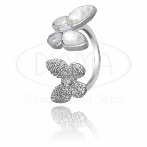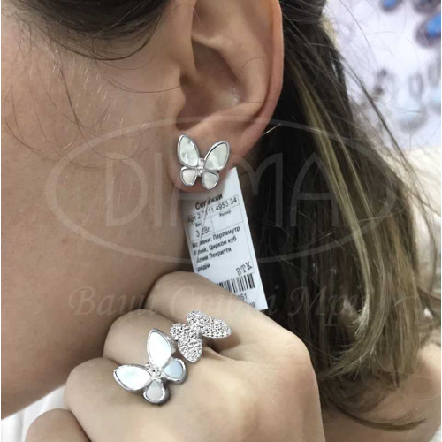 Срібна каблучка з білим Перламутром та цирконом в формі Метелика. Срібло 925 проби, покрите родієм. В наборі присутні каблучка та сережки. Розмір головного елементу каблучки 14х15 та 12х13 мм.