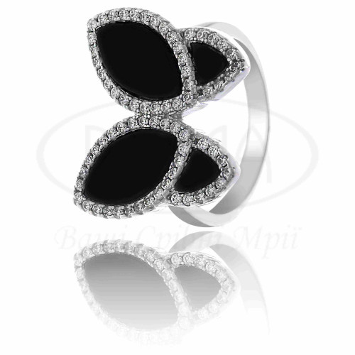 Срібна каблучка з Оніксом та цирконом. Срібло 925 проби, покрите родієм. Комплект виготовлений в формі Метелика, складається з каблучки, сережок та кольє.