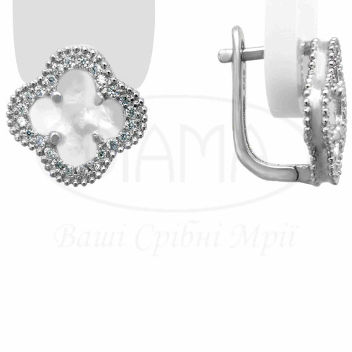 Сережки срібні з білим перламутром та цирконом. Срібло 925 проби, покрите родієм. розмір головного елементу 14 мм.
