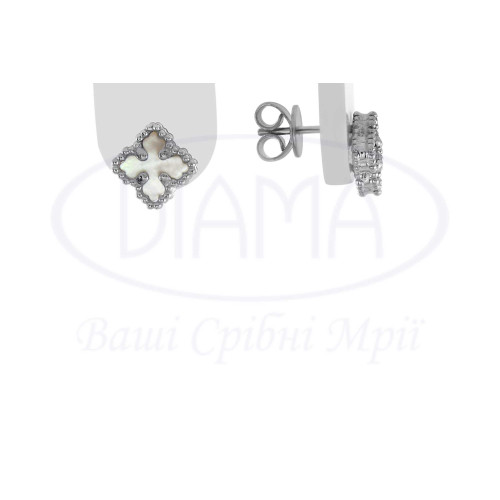 Пусети срібні в формі витягнутого клевера з білим перламутром. Срібло 925 проби, покрите родієм. Розмір клевера 10 мм.