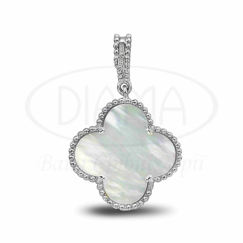 Підвіска срібна з білим перламутром. Срібло 925 проби, покрите родієм. Підвіска виготовлена в формі "Клевер". Розмір головного елементу 18 мм. В наборі присутні каблучка, підвіска та сережки.