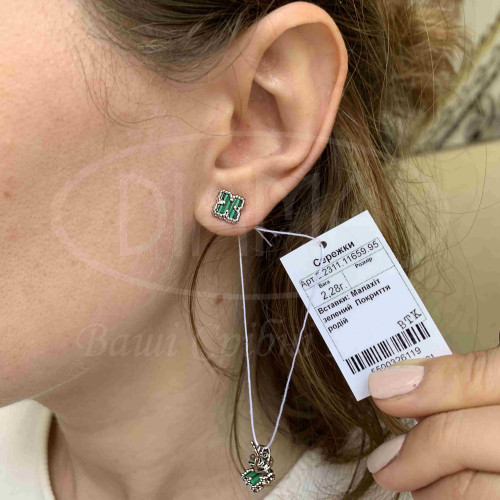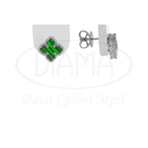 Пусети срібні в формі витягнутого клевера з зеленим малахітом. Срібло 925 проби, покрите родієм. Розмір клевера 10 мм.
