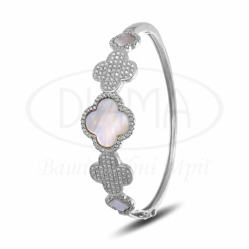 Срібний браслет з білим перламутром та білим цирконом. Срібло 925 проби, покрите родієм. Браслет виготовлений в формі "Клевера". В наборі присутні каблучка та браслет.