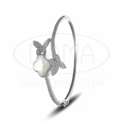 Срібний браслет з білим Перламутром та білим цирконом. Срібло 925 проби, покрите родієм. Браслет виготовлений в формі "Метеликів та Клевера". В наборі присутні каблучка та браслет.