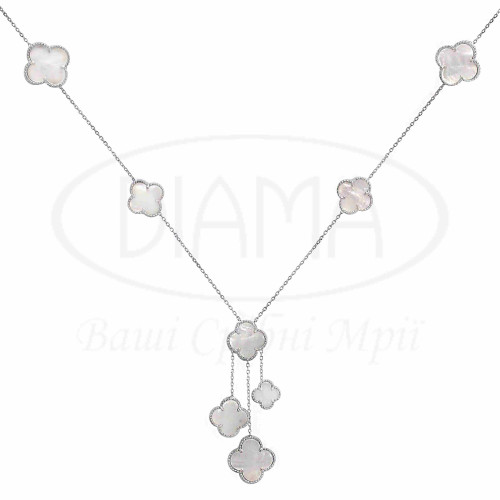 Кольє зі срібла 925 проби, покрите родієм. Виготовлено в формі "Клевер". Вставка з білого Перламутру. В наборі також присутній срібний браслет, сережки та підвіска.