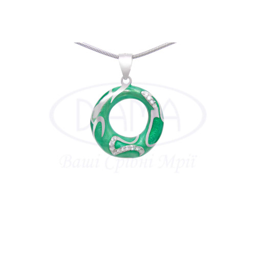 Срібна підвіска з кольоровою емаллю та білим цирконом. Срібло 925 проби, покрите родієм. Діаметр підвіски 18 мм. В комплекті каблучка, сережки та підвіска.