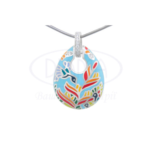 Срібна підвіска з кольоровою емаллю із зображенням птаха та гілок з листям та білим цирконом. Срібло 925 проби, покрите родієм. В комплекті каблучка, сережки та підвіска.