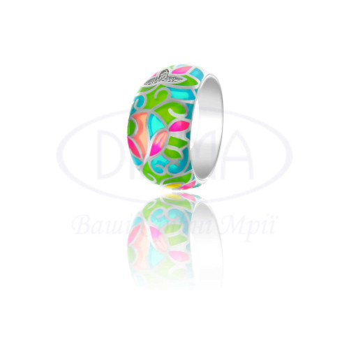 Срібна каблучка з кольоровою емаллю із зображенням квітів та білим цирконом. Срібло 925 проби, покрите родієм. Ширина каблучки 12 мм. В наборі є каблучка, сережки та підвіска.