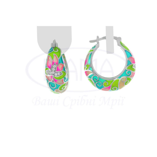 Срібні сережки з кольоровою емаллю із зображенням квітів та білим цирконом. Срібло 925 проби, покрите родієм. Ширина сережки 9 мм. діаметр 20 мм. В наборі є каблучка, сережки та підвіска.