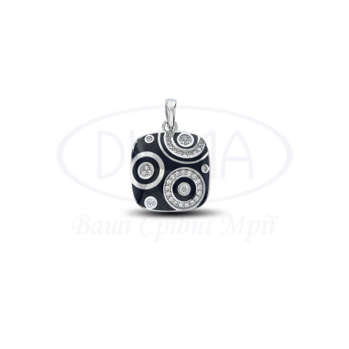 Срібна підвіска з кольоровою емаллю та білим цирконом у формі квадрата із зображенням круга. Срібло 925 проби, покрите родієм. В комплекті каблучка, сережки та підвіска. Розмір головного елементу 18х18 мм.