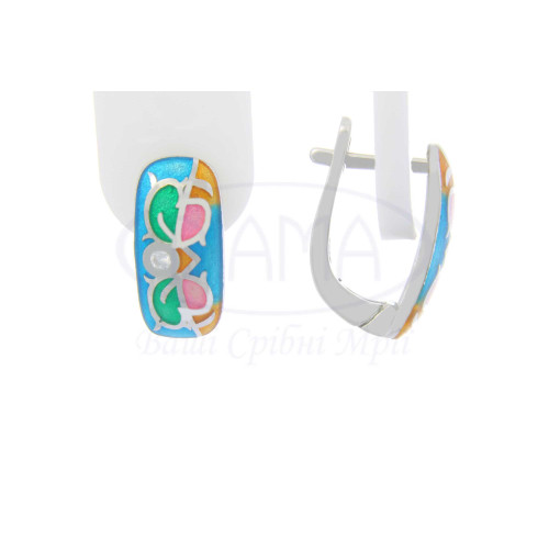 Срібні сережки з кольоровою емаллю та білим цирконом. Срібло 925 проби, покрите родієм. Комплект складається з каблучки, підвіски та сережок.