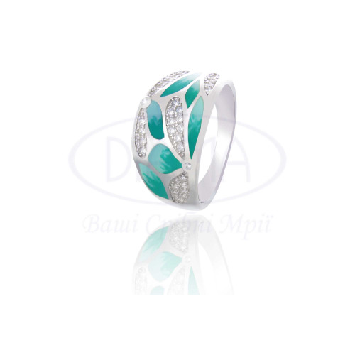 Срібна каблучка з кольоровою емаллю та білим цирконом. Срібло 925 проби, покрите родієм. В комплекті каблучка, сережки та підвіска.