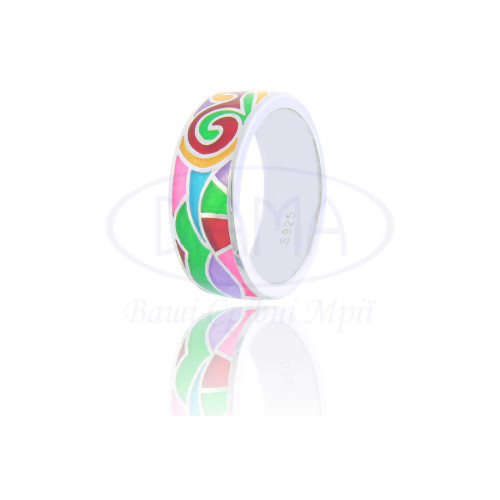 Срібна каблучка з кольоровою емаллю. Срібло 925 проби, покрите родієм. Ширина каблучки 7,5 мм. Комплект складається з каблучки, підвіски та сережок.