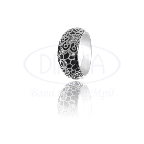 Срібна каблучка з кольоровою емаллю із зображенням квітів та білим цирконом. Срібло 925 проби, покрите родієм. Ширина каблучки 10 мм. В комплекті каблучка, сережки та підвіска.