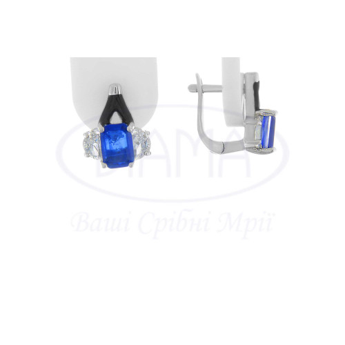 Сережки срібні з синім та білим цирконом, а також чорною емаллю. Срібло 925 проби, покрите родієм. В наборі присутні каблучка, сережки та підвіска.