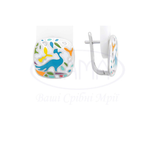Срібні сережки з кольоровою емаллю, на якій зображений павич та білим цирконом. Срібло 925 проби, покрите родієм. В комплекті каблучка, сережки та підвіска.