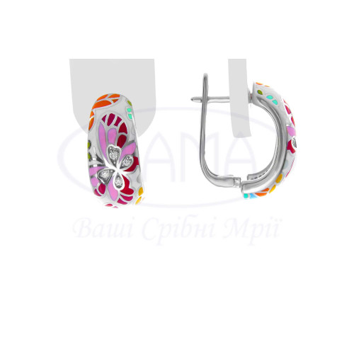 Срібні сережки з кольоровою емаллю у вигляді метелика та білим цирконом. Срібло 925 проби, покрите родієм. Розмір сережки 9х19,5 мм. В комплекті каблучка, сережки та підвіска.