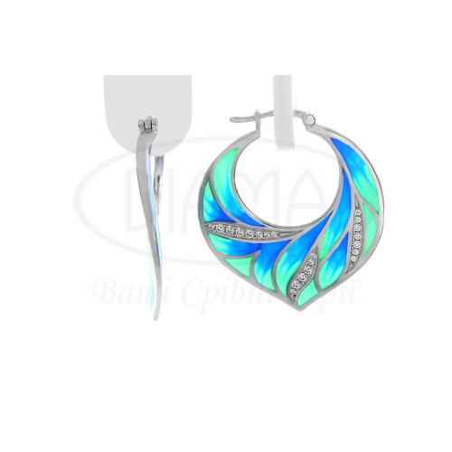 Срібні сережки з кольоровою емаллю та білим цирконом. Срібло 925 проби, покрите родієм. Ширина сережки 29 мм. В комплекті каблучка, сережки та підвіска.