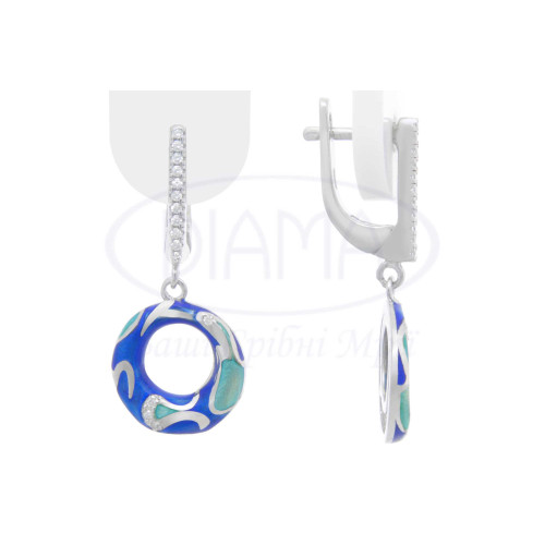 Срібні сережки з кольоровою емаллю та білим цирконом. Срібло 925 проби, покрите родієм. В комплекті каблучка, сережки та підвіска.