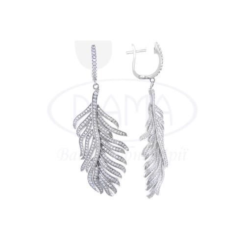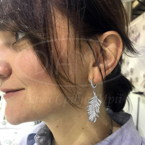 Сережки срібні з білим цирконієм у формі пера. Срібло 925 проби, покрите родієм. В наборі присутні каблучка, сережки та підвіска.
