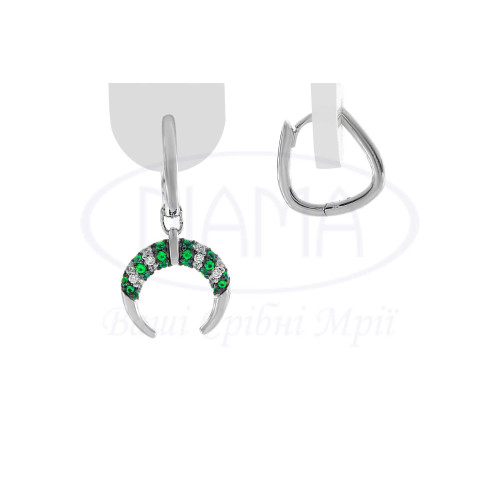 Срібні сережки з зеленим та білим цирконом, одна сережка у формі місяця, а інша без місяця. Срібло 925 проби, покрите родієм.
