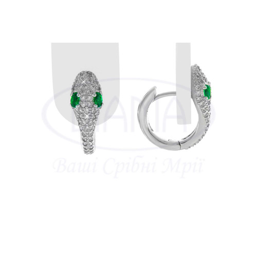 Срібні сережки в формі Змії з зеленим та білим цирконом. Срібло 925 проби, покрите родієм. Ширина голови 7 мм.